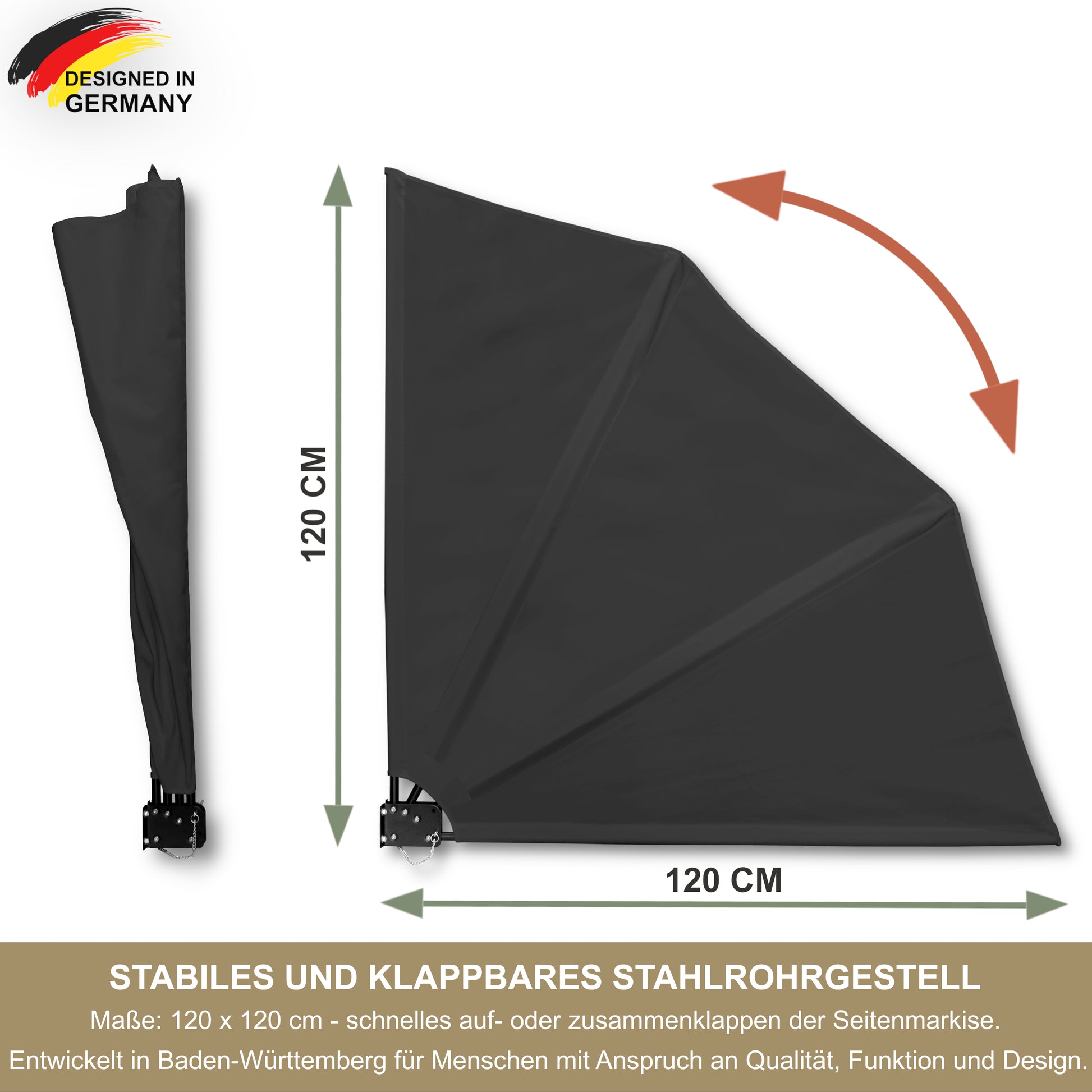 - Stabil und flexibel verstellbar: Das schwarze Stahlrohrgestell sorgt für sicheren Halt und dauerhafte Stabilität. Die Seitenmarkise lässt sich je nach Bedarf schnell auf- oder zusammenklappen – ideal bei wechselnden Licht- und Windverhältnissen.
