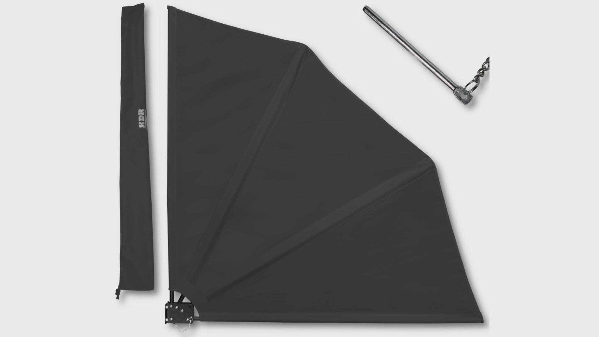 Das pulverbeschichtete Stahlrohrgestell in Schwarz sorgt für sicheren Halt und dauerhafte Stabilität. Der Fächer lässt sich mühelos auf- und zuklappen – ideal für wechselnde Licht-, Wind- oder Sichtverhältnisse. Eine stabile Wandplatte bildet die Basis für die Montage, während ein extra langer Verriegelungsbolzen mit robuster Kette für zuverlässige Fixierung sorgt – auch bei Wind.