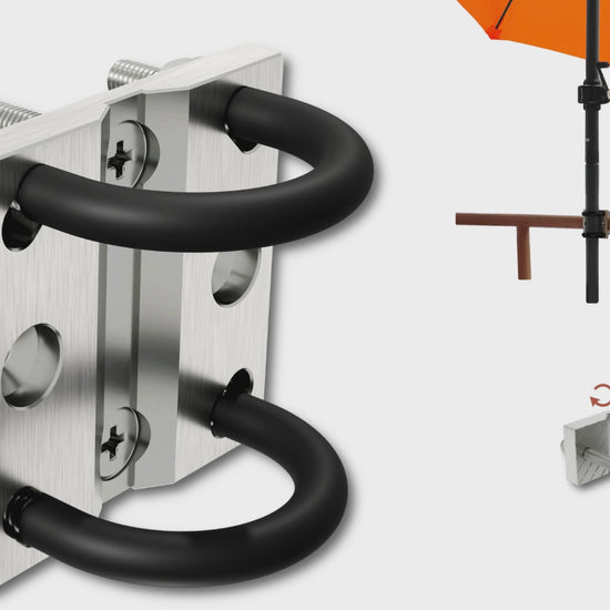Die Fixierung erfolgt über zwei stabile Bügel mit Bügelschutz, die den Schirmmast in einer zentralen Nut sichern. Durchmesser von 2,8–5 cm werden zuverlässig gehalten – selbst bei Wind. Geeignet für Schirme bis Ø 350 cm (rund) bzw. 300 × 200 cm (rechteckig).