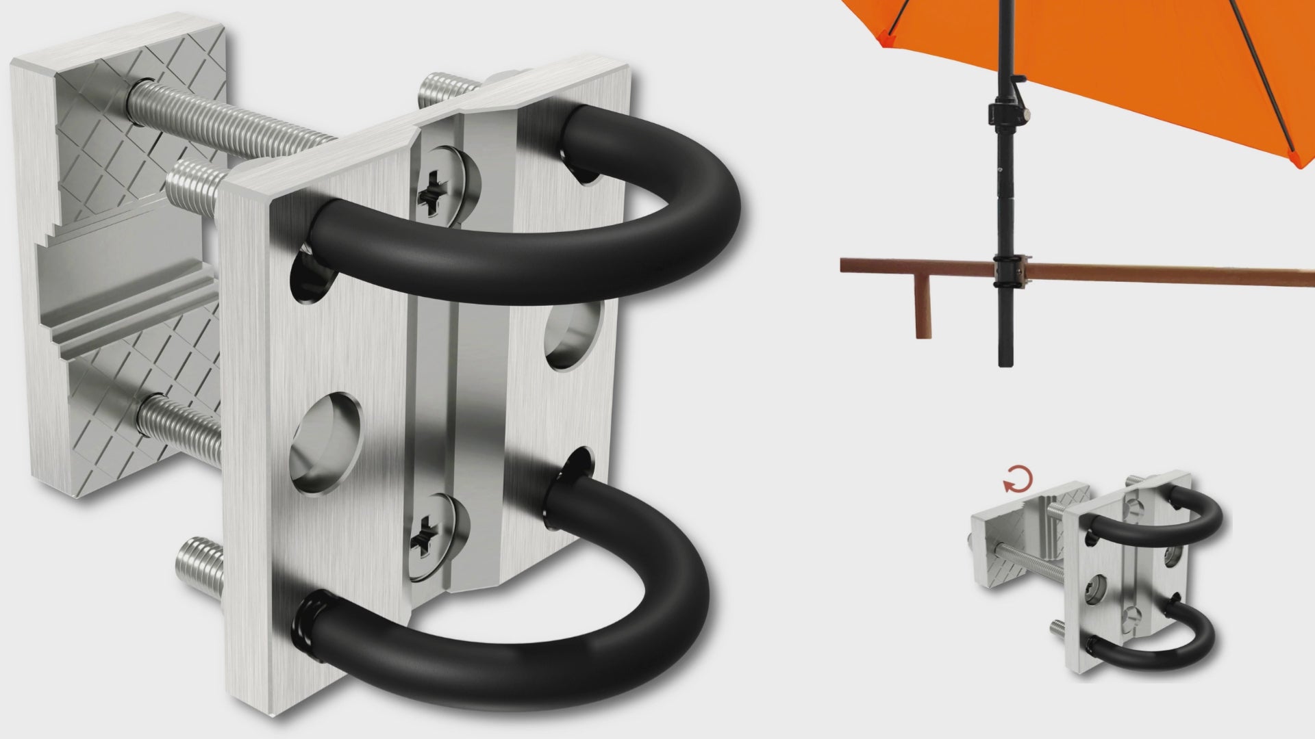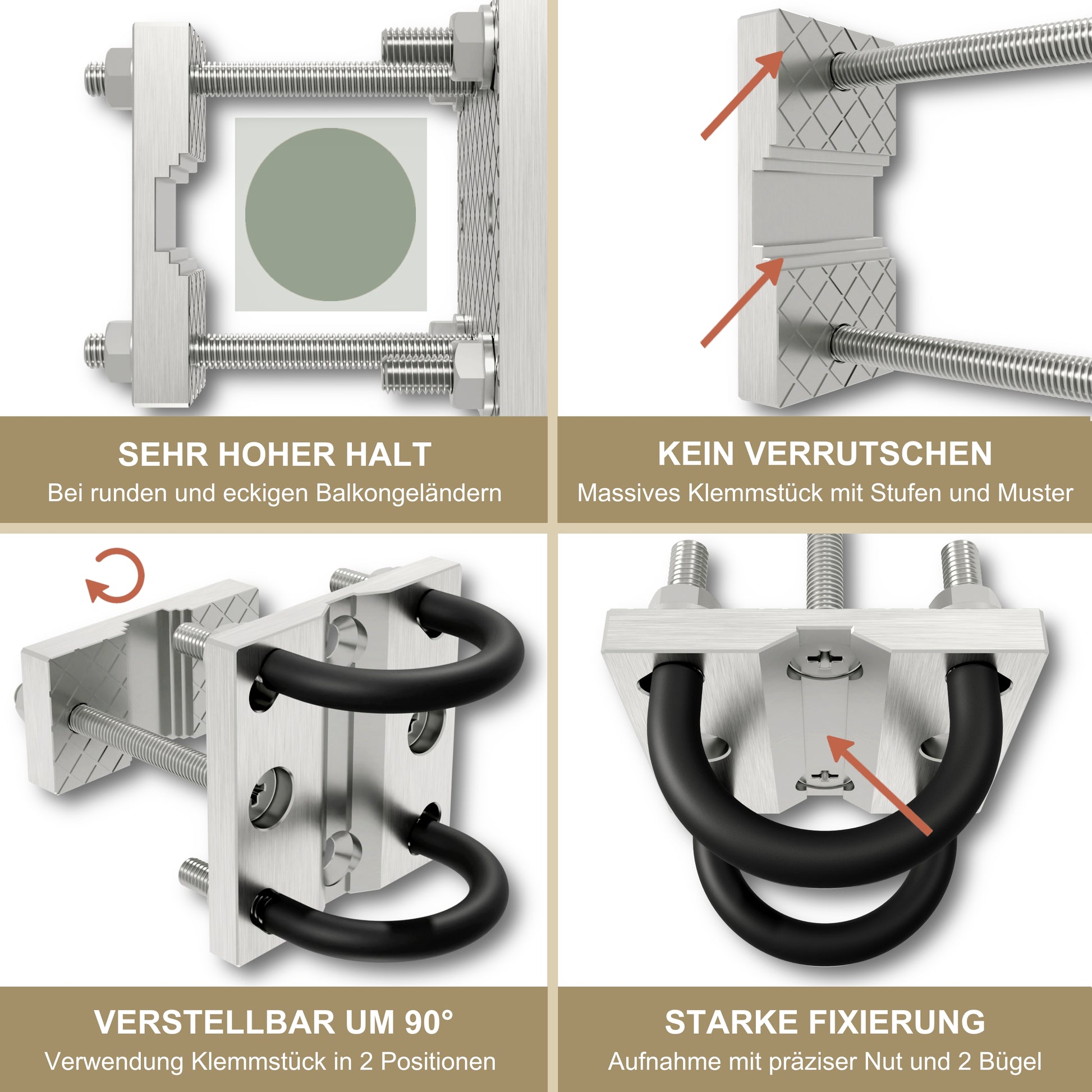 Die Halterung kann an runden Geländern (Ø 2,5–5cm) sowie an eckigen Profilen bis 6 × 5 cm befestigt werden – horizontal oder vertikal. Eine rückstandsfreie Klemmung macht das Produkt ideal für Mietobjekte.