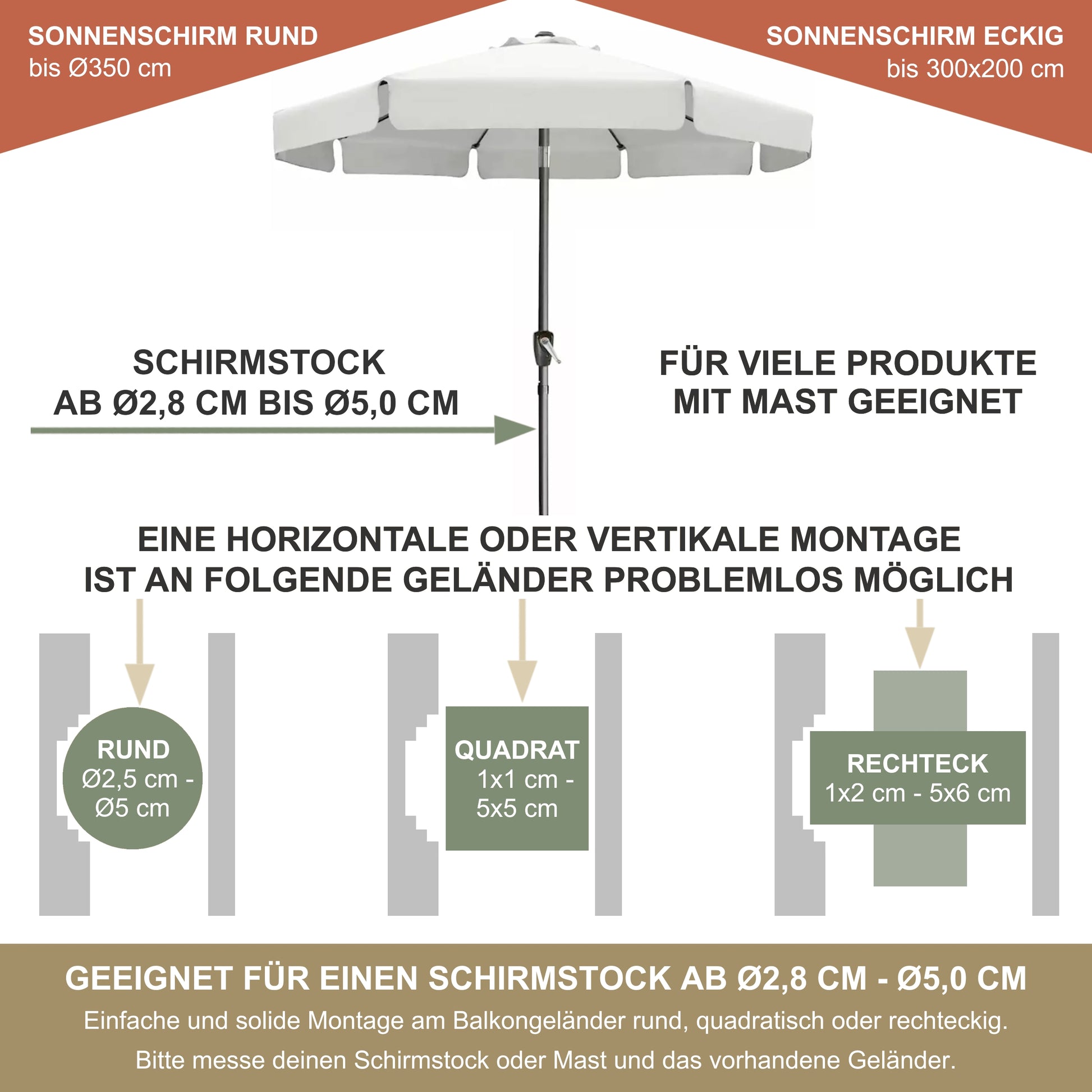 Sonnenschirmhalter Edelstahl für Balkongeländer rund & eckig – bis 350 cm, Schirmständer, stabile Bügel-Halterung, sichere Befestigung am Geländer (Kopie)